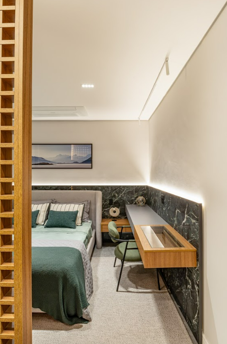 Já nos ambientes íntimos, o projeto assume um tom mais sensorial e acolhedor. Texturas suaves, iluminação natural cuidadosamente aproveitada e soluções funcionais garantem conforto no dia a dia, criando espaços pensados para o descanso e a privacidade, sem perder a coerência estética do conjunto.