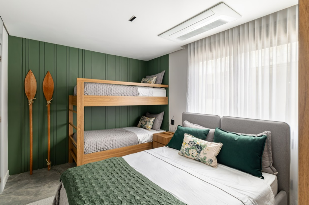 No dormitório, o projeto assume um tom mais sensorial e acolhedor