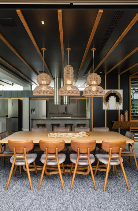 Na área social, os ambientes amplos e bem iluminados foram desenhados para estimular a convivência. A integração entre estar, jantar e áreas externas favorece encontros, circulação livre e diferentes formas de uso, sempre conectadas à paisagem e à luz natural.